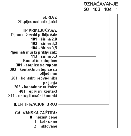 | Terminali Pljosnati priključci PROVODNIČKE SPOJNICENamena Pljosnati priključci omogućuju jednostavno i brzo, bez upotrebe alata, spajanje provodnika sa odgovarajućim uredajem ili nastavljanje provodnika. Odgovarajuća konstrukcija i kvalitet izrade omogućuju i do 10 uključivanja i isključivanja a da ne dode do bitnih promena u kvalitetu uspostavljenog kontakta. Priključci oblika B se koriste pojedinačno, a oblika A grupisani u kućišta koja takođe proizvodi FKS, a koja omogućuju njihovo istovremeno uključivanje i isključivanje, pri čemu ih jednovremeno osiguravaju od međusobnog dodira, odnosno dodira sa masom ili kućištem uređaja. Kontaktne utičnice služe za završavanje jednog ili istovremeno više provodnika radi priključivanja u odgovarajuću stezaljku (klemu). Kontakti provodnika paljenja se koriste za spajanje provodnika paljenja u sekundarnom kolu visokog napona uređaja za paljenje vozila sa indukcionim razvodnikom visokog napona uređaja za paljenje vozila sa indukcionim razvodnikom visokog napona i svećicama. Oblik I je za svećicu a oblik II za razvodnik. Kontaktne stopice omogućavaju uz pomoć vijka čvrstu i pouzdanu vezu krajeva provodnika sa priključnim mestima na uređaju. Tip 301 sa rupom a 303 sa viljuškom. Opružni kontakt za štampana kola se koristi u kućištu kataloški broj 21-401-101 koje omogućuje direktno uključivanje štampane ploče. Namenjen je za primenu u automobilskoj industriji. Provodničke spojnice iz programa FKS odgovaraju normama DIN, zatim zahtevima propisa FIATA-a i ZASTAVE. Atestirani su od strane Zavoda ?Crvena Zastava? - Kragujevac. Sve provodničke spojnice se isporučuju u nizu namotani na plastične kalemove a predviđeni su prvenstveno za poluautomatsku i automatsku montažu na posebnim mašinama. U zavisnosti od maksimalne radne temperature provodničke spojnice se izrađuju od legure bakra sa cinkom (kalajsm) ili čelika.