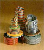 Single, multi-core, braided coaxial and ribbon conductors and cables of small cross-section (0,014 up to 1 ,5 mm2) or with leonic threads, with insulation of PVC, PE, teflon, polyester, polyamide and other materials, with PVC, PE or polyurethane outer sheath.